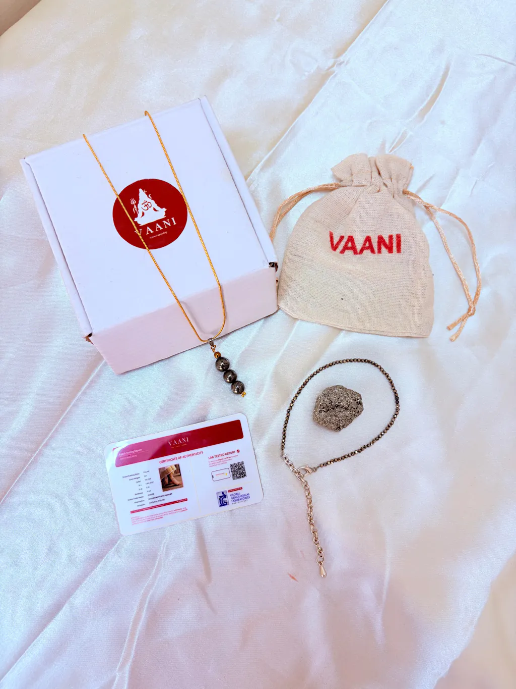 Unlock the energy of wealth, protection, and abundance with the Mahalaxmi Ultimate Pyrite Combo by Vaani. This powerful trio is carefully curated to attract prosperity, boost confidence, and shield you from negative energies—making it the perfect everyday luxury with a purpose.